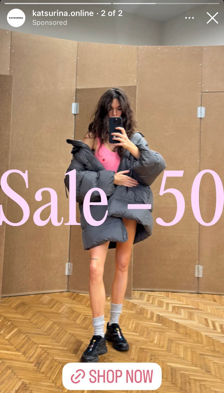 Below, you will find how a clothing brand announces its 50% sale using sponsored content that appears between Instagram Stories. This is an effective way to drive the attention and interest of prospects who might have looked for similar products.