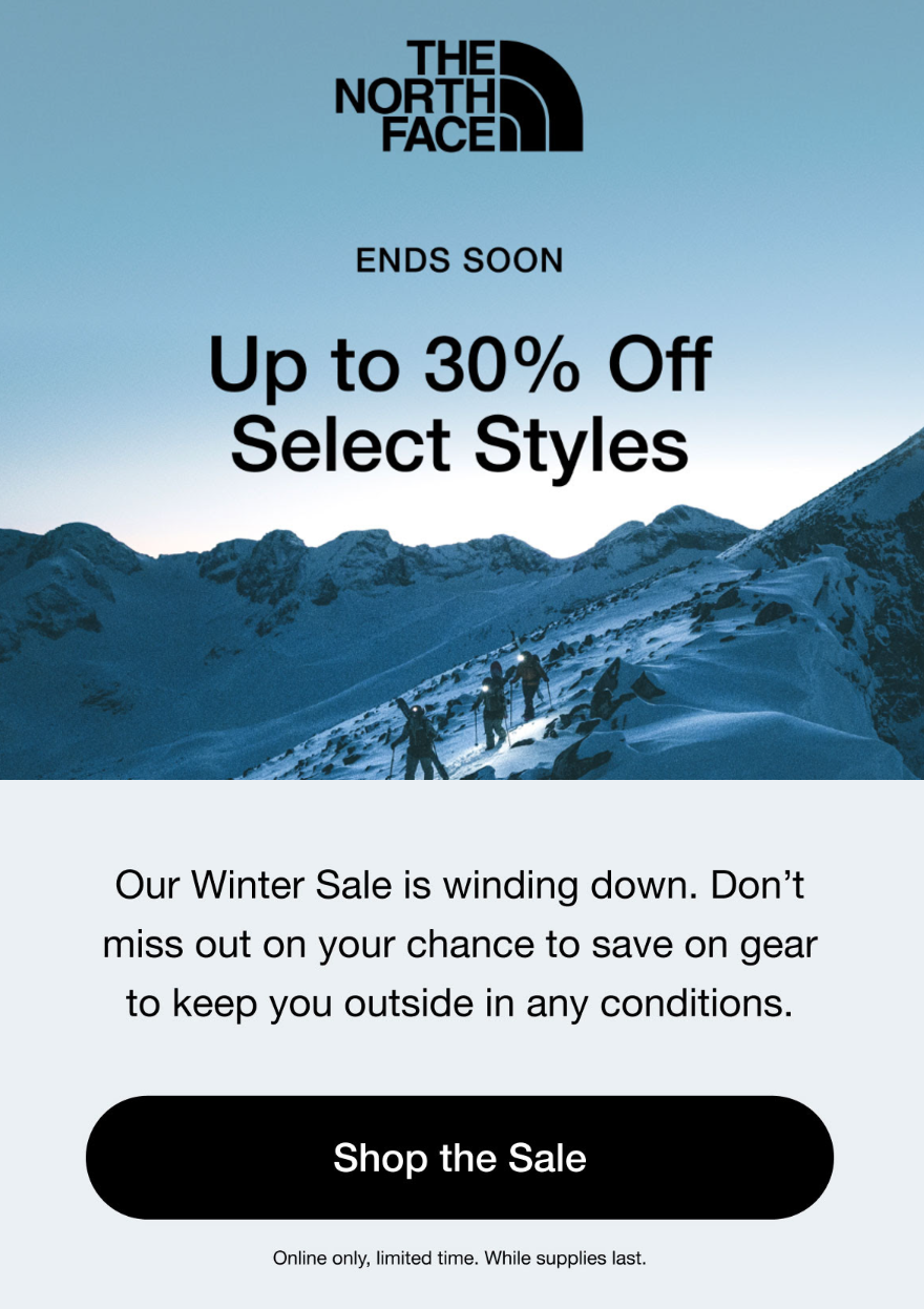 Let’s consider The North Face’s email campaign for the end-of-season sale. By limiting the duration of the sale, the brand effectively drives leads toward conversion.