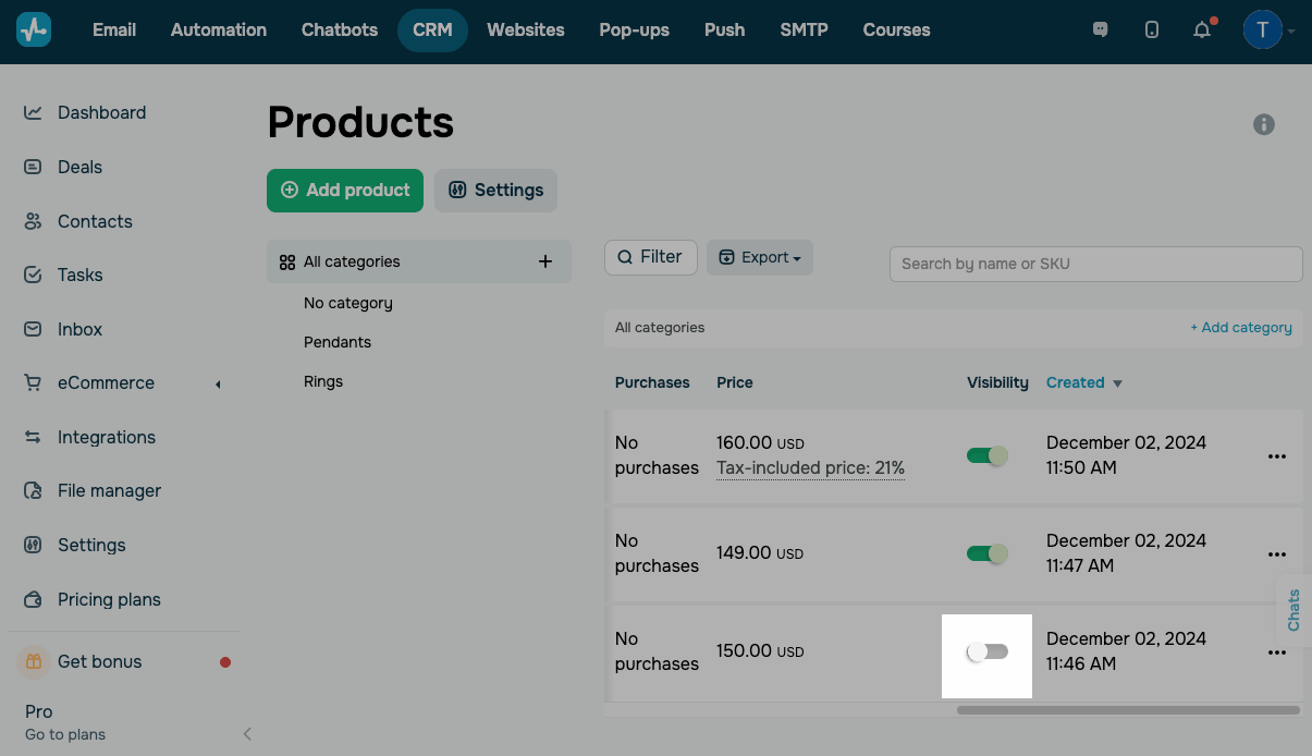 Ve a CRM > eCommerce > Productos. Abre la categoría que contiene tu producto. En la columna Visibilidad, desactiva la opción situada junto al producto.