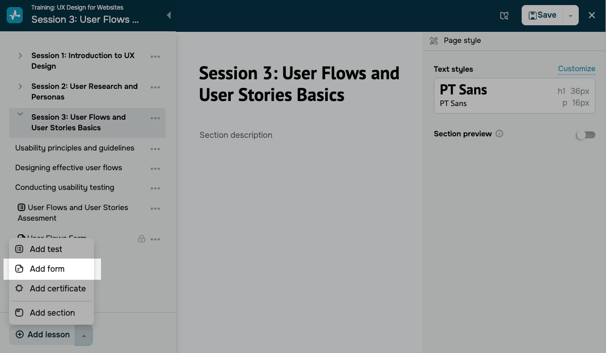 En el creador de lecciones, haz clic en la flecha situada junto a Añadir lección y selecciona Añadir formulario.