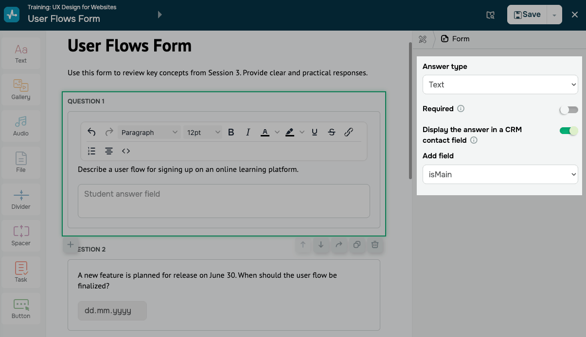 Para guardar la respuesta del estudiante en el sistema CRM, activa la opción Mostrar la respuesta en un campo de contacto CRM. En Añadir campo, selecciona el campo de contacto CRM donde el sistema debe guardar el valor.