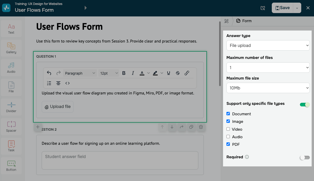 | Número máximo de archivos | Limita el número de archivos que un estudiante puede subir para una pregunta específica. |