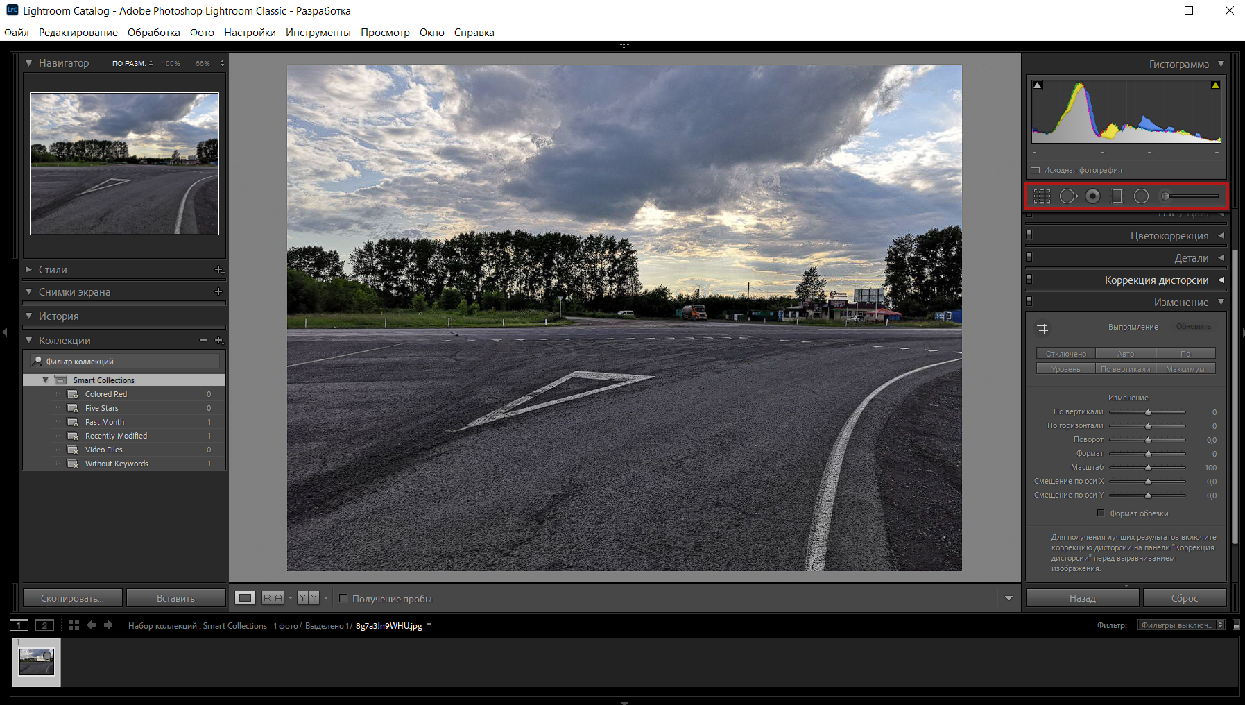 Коррекция дисторсии. Работает с искажением, а также позволяет добавить виньетку — затемнить края.