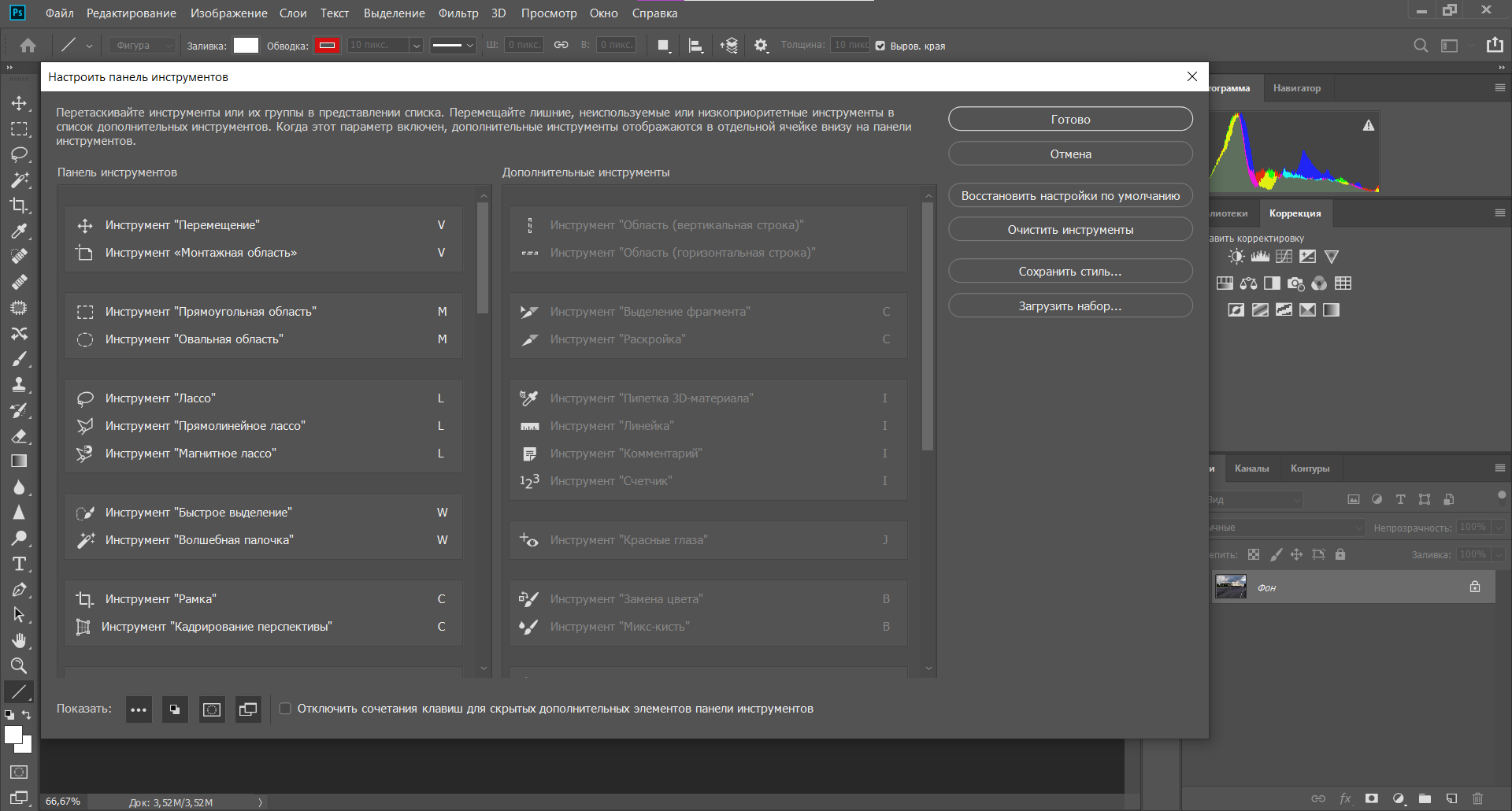 На скриншоте ниже — настройки панели инструментов, где вы можете подобрать свой набор и задать быстрые клавиши. Ее можно настроить в разделе «Редактирование» — «Панель инструментов».